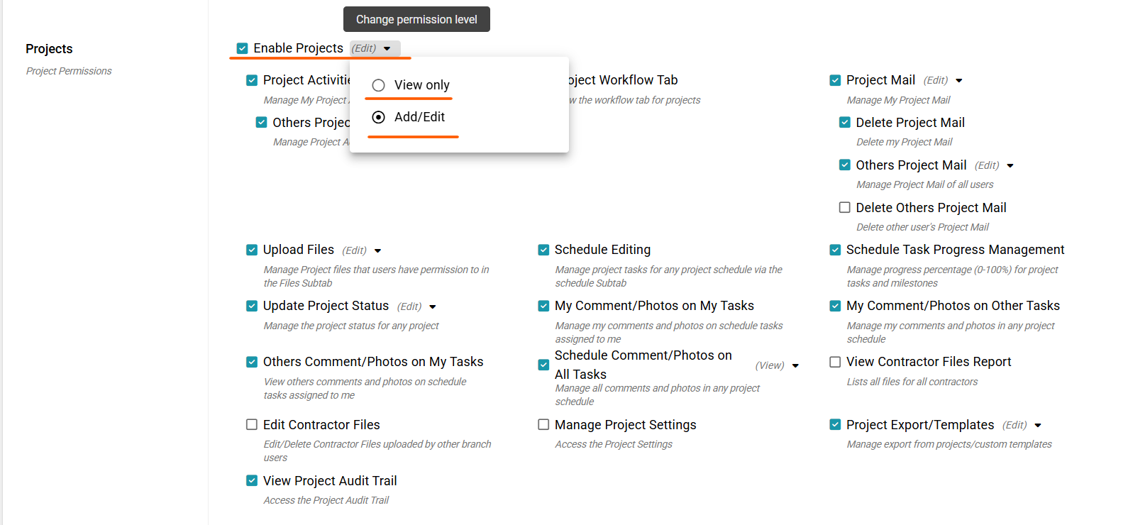 We’ve added a new permission that allows you to control Project visibility for staff. Sometimes you may not want certain staff to see projects, or you may only want them to have view-only access. This is now possible with the new Projects Permission. Since projects have always existed, this permission was enabled by default for all users. Now, you can choose between View Only, Full Add/Edit/Delete or No Access. This gives you greater control over who can see and interact with projects in your system.